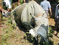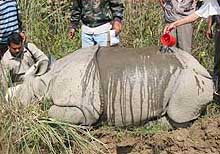 Con la madre y su cría dormidas, el Dr. Shanta Raj Gyanwali, director del Equipo Técnico de Traslado, se apea de su elefante, tapa los ojos de los rinocerontes con una tela, y comienza sus preparaciones. Ahora el tiempo es esencial, pues el veterinario desea que los animales permanezcan dormidos el menor tiempo posible. Se excava una fosa a pocos centímetros de las bestias, los técnicos toman numerosas medidas — largo, temperatura, patrones de respiración y otras estadísticas vitales. Rápidamente se sujeta un collar radiotransmisor a la madre.