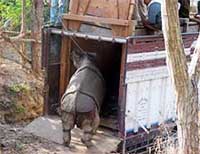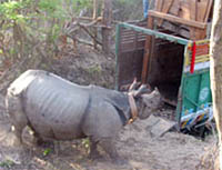 Son las 9:30 de la mañana y comienza un largo día y una larga noche para los rinocerontes. Ambos serán llevados al Real Parque Nacional Bardia de Nepal, unos 300 kilómetros al oeste de su actual morada en el Real Parque Nacional Chitwan.