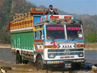 A las 4 PM. comienza el largo, lento e incómodo viaje. Por las próximas 15 horas los rinocerontes viajan en un camión Tata verde y azul, decorado con estrellas, escenas de montaña, oropel multicolor e íconos hindúes.