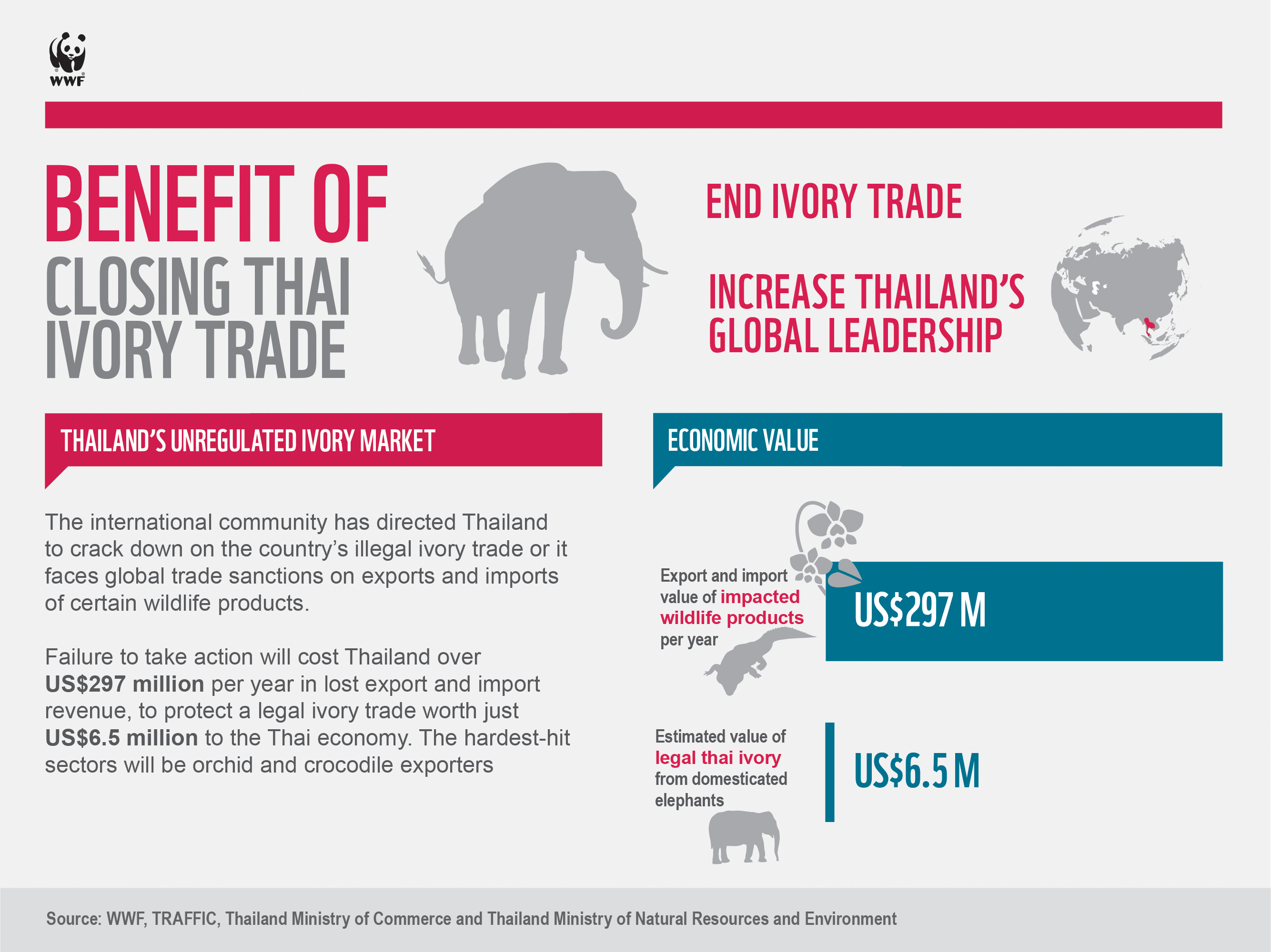 WWF urges that the simplest and most effective way for Thailand to avoid global trade sanctions under the Convention on International Trade in Endangered Species (CITES) is to shut down the domestic ivory market, that is making it possible for organized criminal syndicates to launder massive quantities of illegal ivory smuggled into the country.