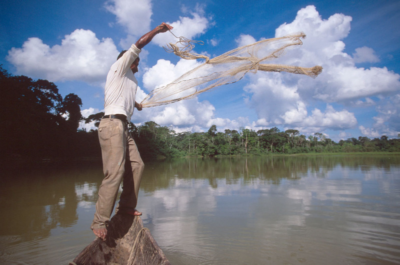 Member of the Fishermens Association of Sena Madureira and Mauel Urbano casts net fishing on one of the lakes in the Purus River system near Sena Madureira. Floorplain Resources Management project int he Upper Purus River Basin, part of one of the WWF Freshwater projects sponsored by HSBC. Acre State, Brazil